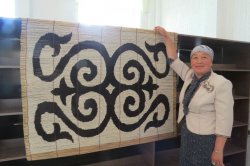 Жительница Тюпа Г.Жээналиева делает циновки из чия и разноцветной шерсти