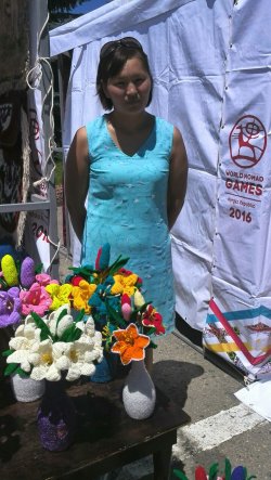 32-летняя Ж.Жакыпова из Тюпа вяжет цветы в горшочках стоимостью до 800 сомов